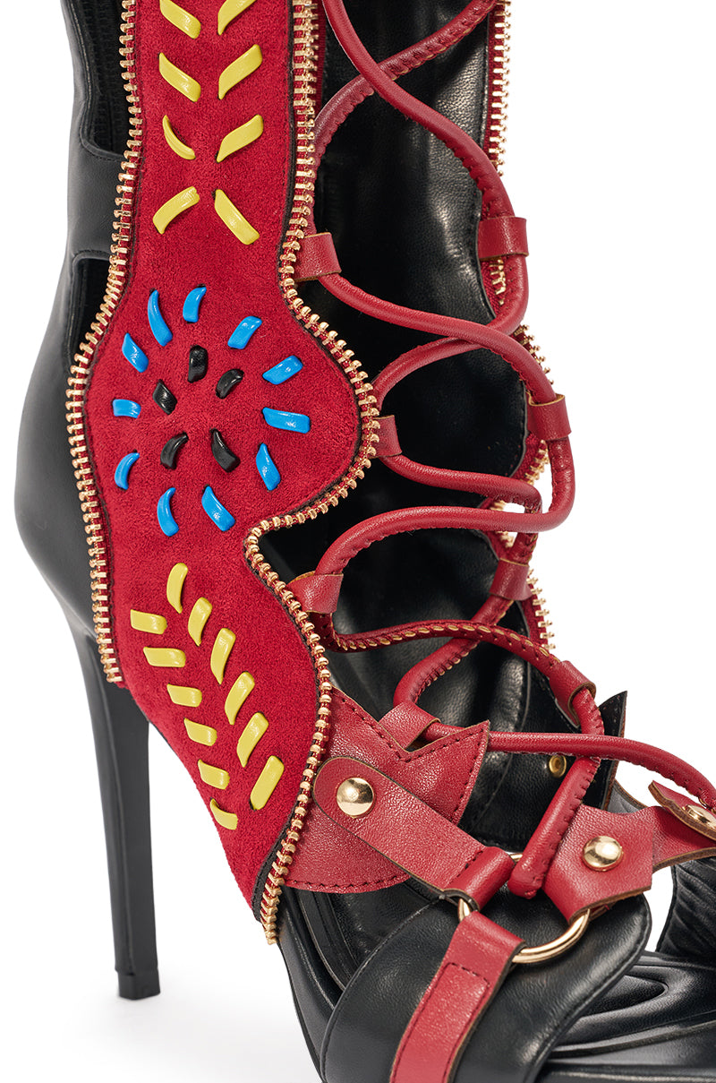 Statement lace-up gladiator stiletto heels designed for bold, head-turning style. This striking pair of heels features a sleek black faux-leather upper with a towering stiletto heel, a sculpted open almond-toe front, and a dramatic knee-high silhouette accented with gladiator strap detailing and a back zipper enclosure. Rich burgundy suede panels are enhanced with multicolor embroidered motifs, gold-tone hardware zippers, and adjustable wraparound faux leather laces for a secure, customizable fit. Style these heels with mini dresses, bodysuits, or sleek shorts for festival looks, nightlife outfits, or elevated statement streetwear.