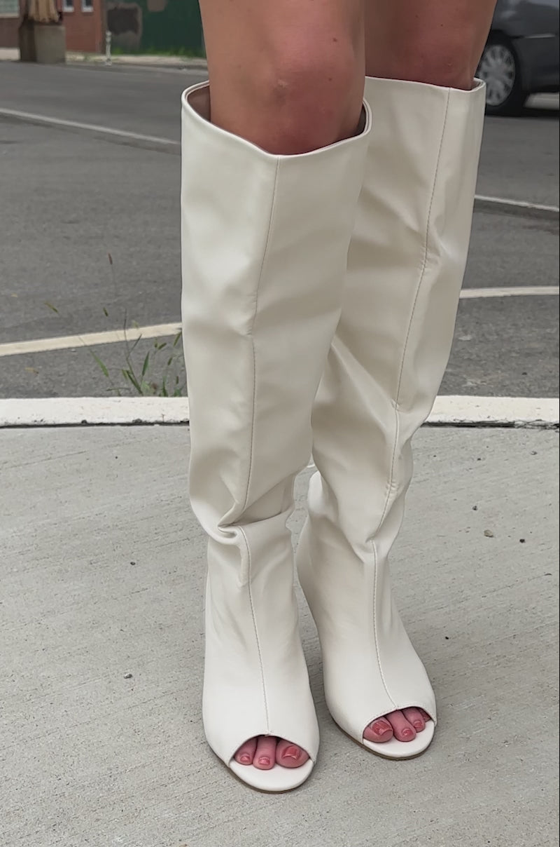 The AZALEA WANG Sizani White Wedge Slouchy Boot is crafted from supple faux leather and features an almond peep toe silhouette, a sleek short heel, a slouchy knee-high shaft, and a pull-on fit. Try styling with a maxi skirt and fitted blouse for a versatile, daytime chic to sultry night out ensemble.