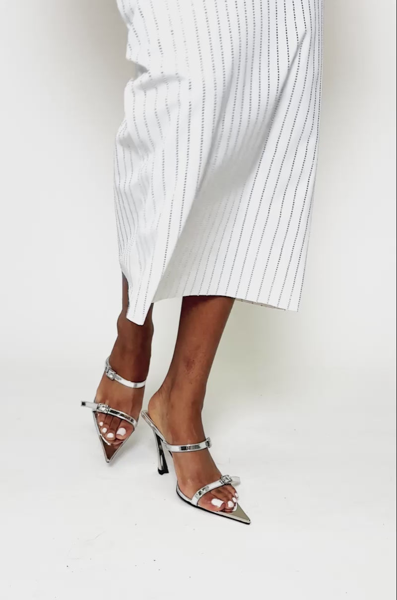This time, silver takes first place. The AZALEA WANG Swen Silver Stiletto Sandal is a sleek style crafted from gleaming, metallic faux leather. These shiny shoes feature a sharply pointed open toe with a mirrored accent panel, a uniquely sculpted, flared stiletto heel, a Comfort Cushion insole, and two thin, adjustable straps with buckled closures.