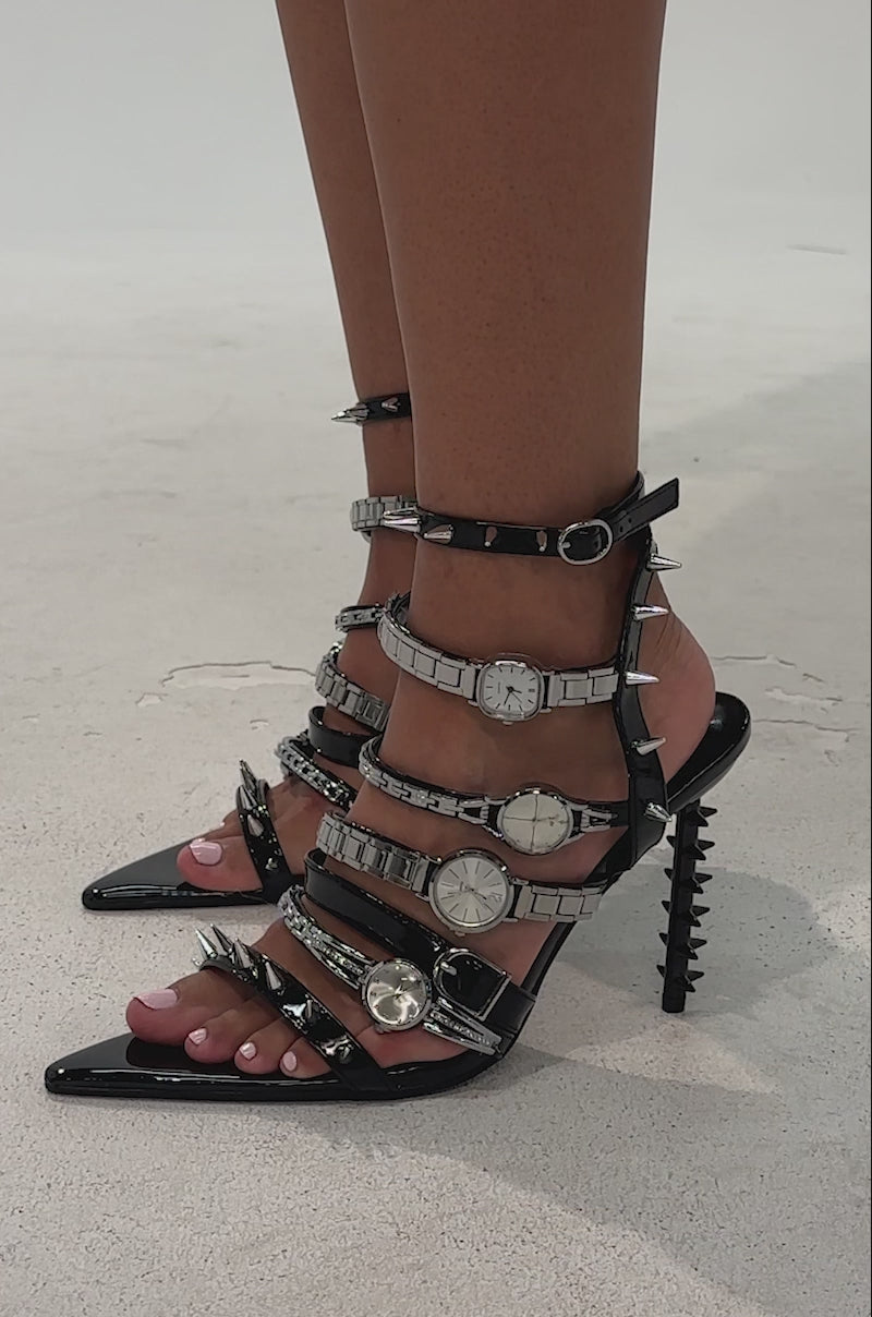 Make every second count in the AZALEA WANG Sydondia Black Watch Shoe Stiletto Sandal. Crafted from glossy patent faux leather, this cutie features an open pointed toe, a slim stiletto heel with tonal spiked detailing, and a series of edgy, adjustable ankle and foot straps adorned with faux silver metallic watch faces, rhinestone bands, buckles, and punk-chic spike hardware for a statement-making look. Complete with a cushioned insole, and a step-in fit. Equal parts rebellious and luxe, this sandal turns every step into a power move—perfect for fashionistas who live on their own timeline.