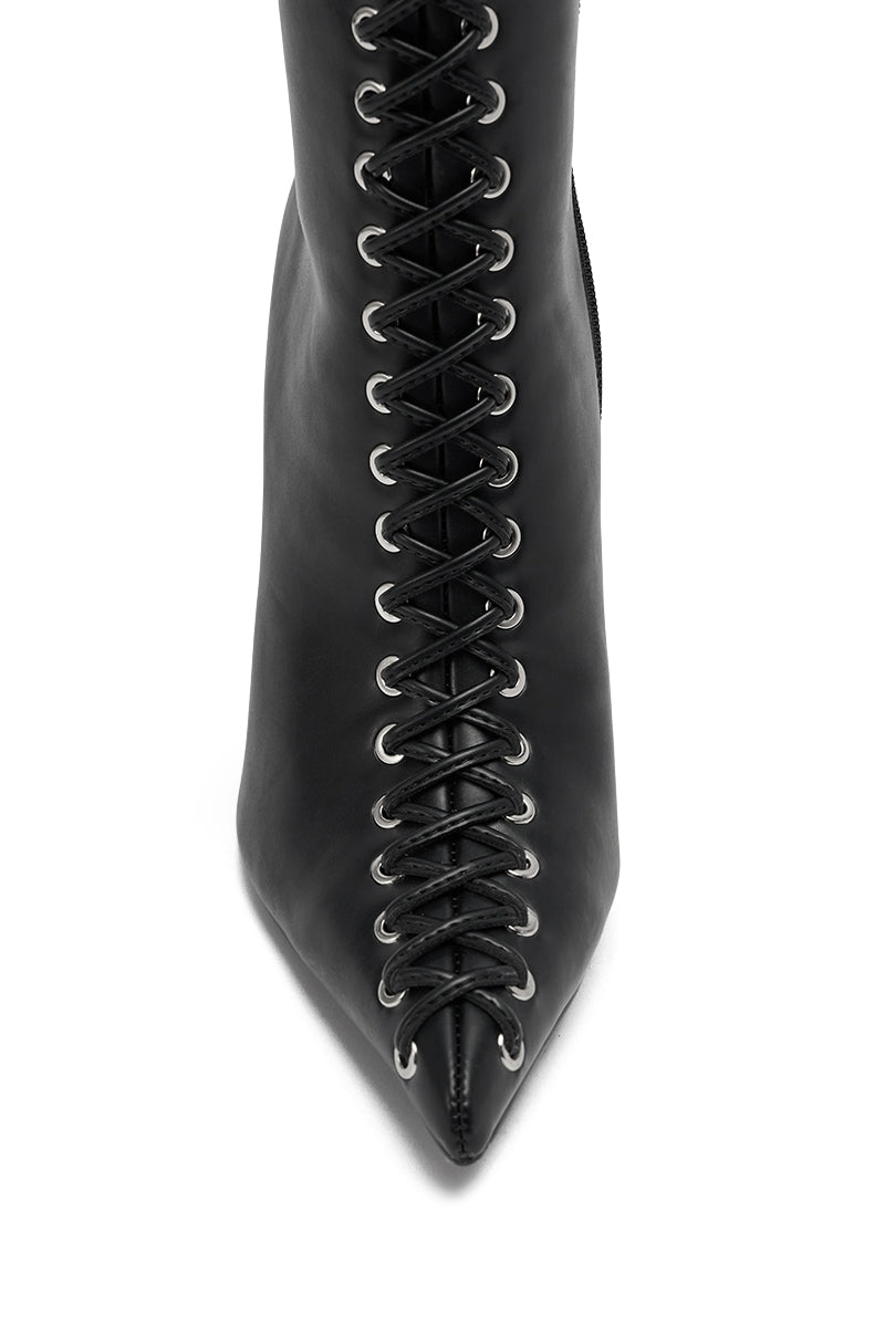Strap in for sexiness. The AZALEA WANG Thaumus Black Lace Up Wedge Boot is crafted from buttery faux leather and boasts a knee-high shaft lined with full-length leather lace-up detailing down the front and back, a pointed toe, a slim wedge heel, and an inner ankle zip closure.