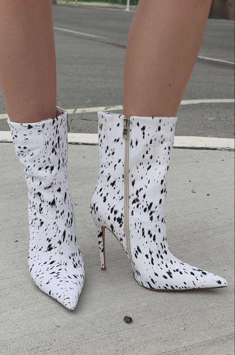 No shades of grey, just attitude! The AZALEA WANG Tyelor White Black Pony Hair Bootie is crafted from genuine pony hair with a natural spotted pattern and features an ankle-high shaft, a pointed toe, a slim stiletto heel, and an inner ankle zip closure. Complete with a pull-on fit. Try pairing with a leather maxi skirt, a fitted blouse, and silver-tone hoop earrings for an elevated luxe ensemble.