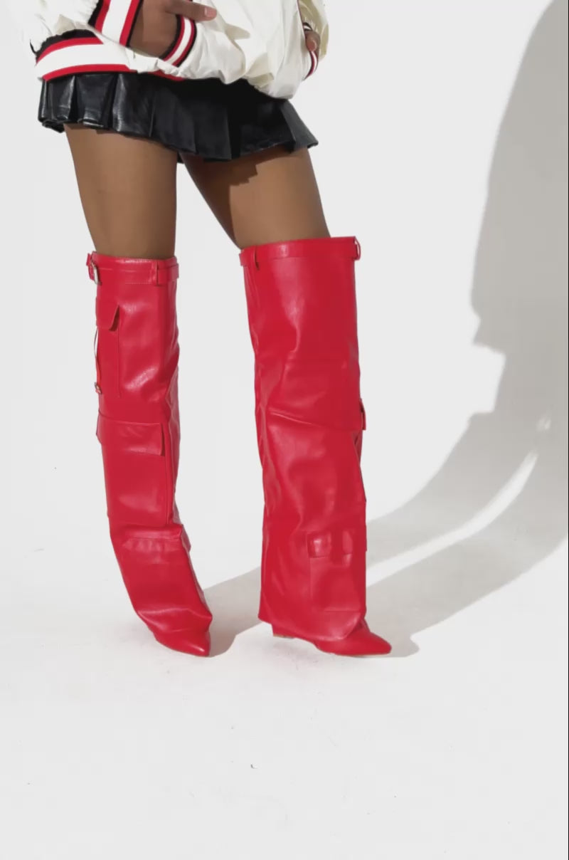 We can't get enough of The AZALEA WANG Alexia Fold Over Wedge Boot In Red! This faux leather boot features a thigh-high shaft, a belted detail at the top, various flap pockets, and a covered wedge heel. Complete with a pointed toe and slip on fit. This ultra-versatile boot is the perfect transitional wardrobe staple. Pair with mini dresses and trench coats, skinny jeans and knits, or tights and mini skirts for extra edge.