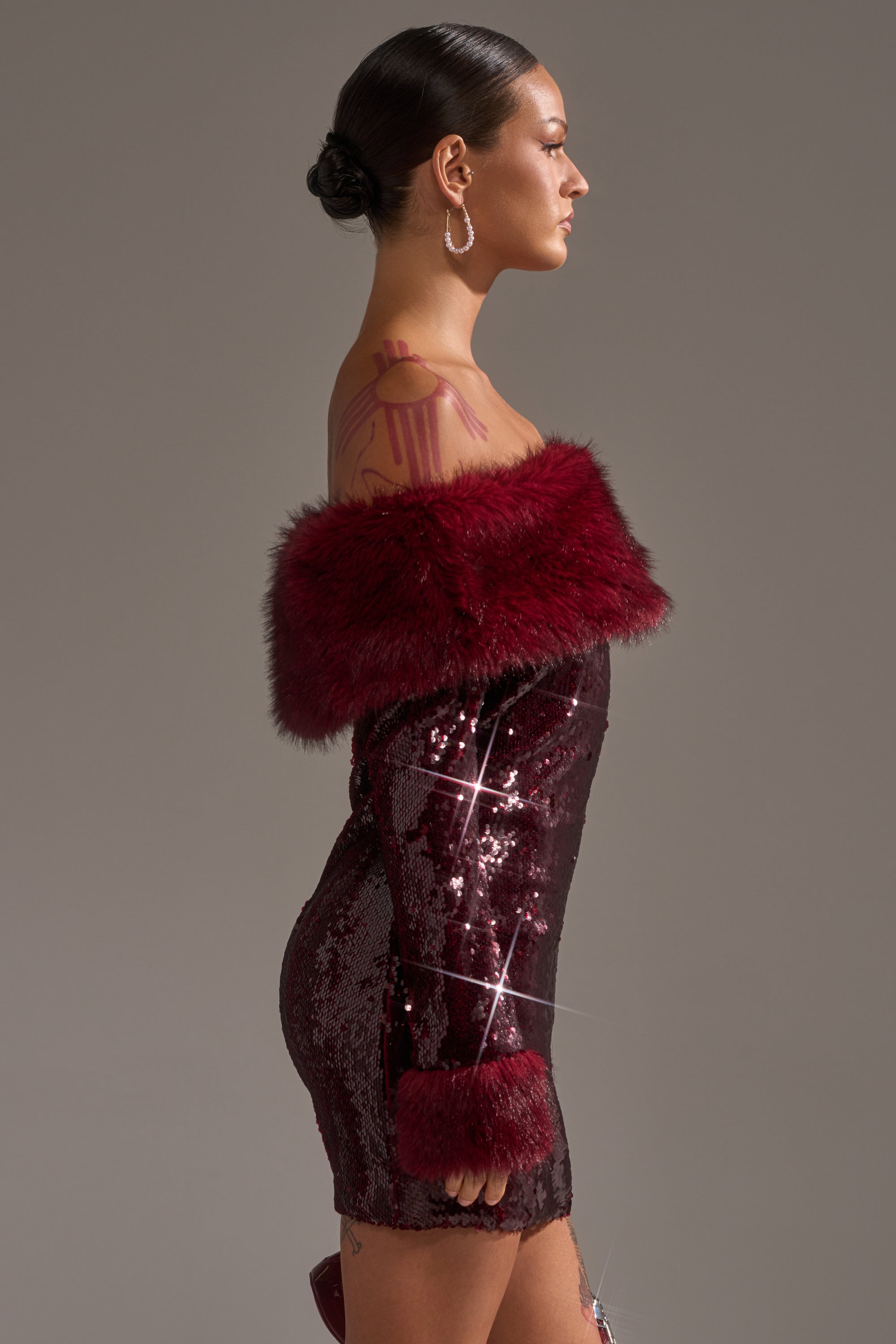 The AKIRA Label Baby It's Cold Outside Fur Trim Sequin Mini Dress brings glamour with a cozy twist. This off-the-shoulder mini dress features allover shimmering sequins that catch every light, framed by plush faux fur trim along the neckline and cuffs. Designed with long sleeves and a body-hugging silhouette, it’s the perfect fusion of warmth and sparkle. Complete with sleek inner lining and a tonal side-zip closure. Pair it with statement heels and a clutch for a festive night out or a chic holiday event.