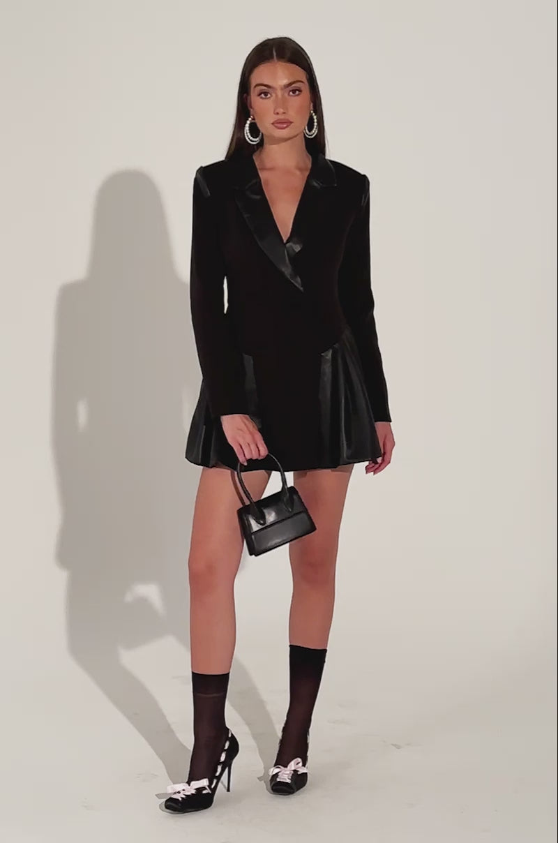 BACK TO BUSINESS FAUX LEATHER DETAIL PLEATED BLAZER DRESS