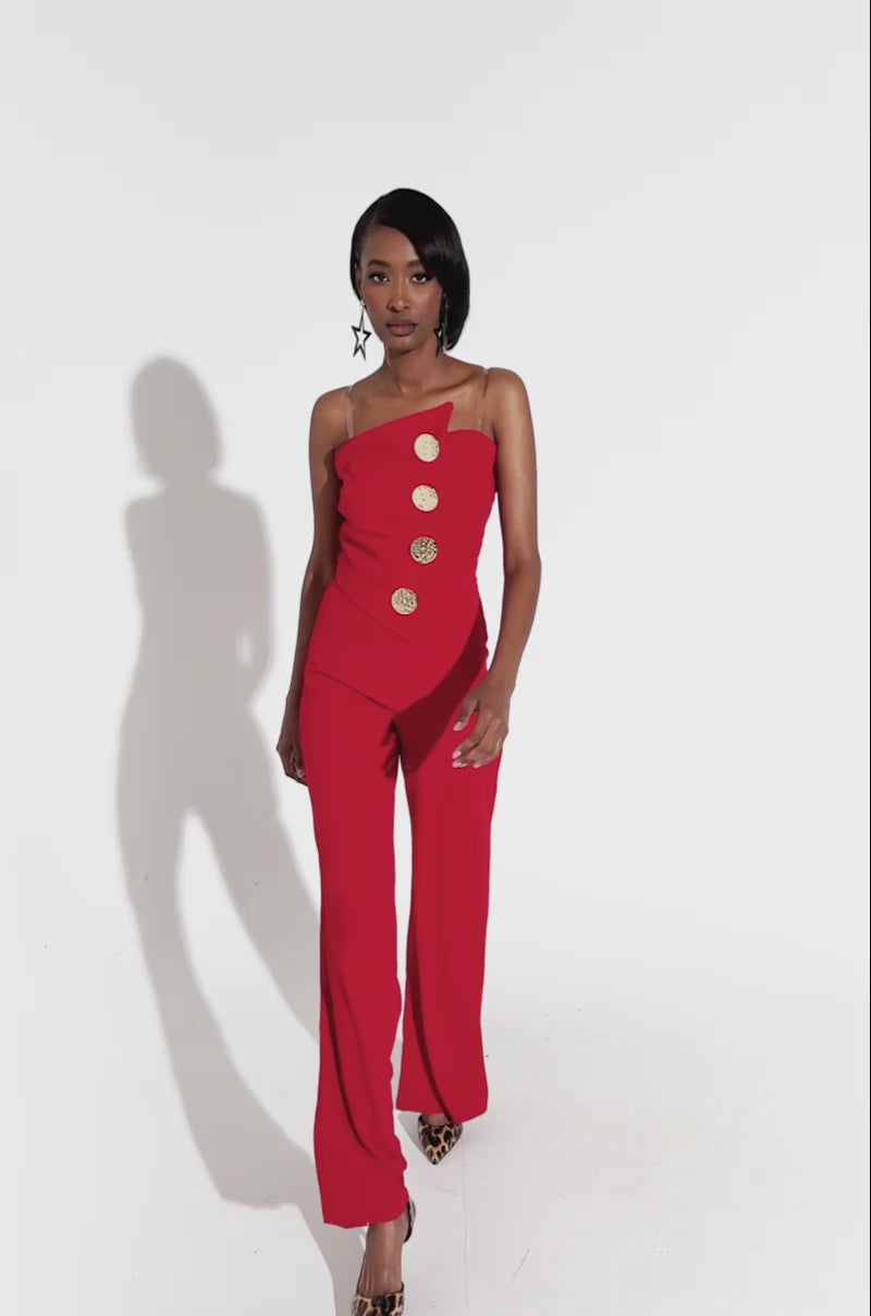 BADDIE STRAPLESS JUMPSUIT WITH GOLD BUTTONS