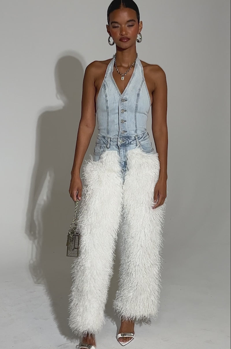 Serving looks with zero chill. The AKIRA Label Baddies Only Denim Fur Jumpsuit is crafted from light-wash, semi-stretchy denim and boasts a structured halter bodice with a plunging neckline, contoured seam detailing, a snap-button front closure with silver metallic hardware, and an exposed back with a horizontal studded strap accent. The lower half features functional belt loops, a classic five-pocket design, and a wide-leg silhouette lined with ultra-plush, white faux fur paneling. Pair with platform sandals, hoop earrings, and a metallic shoulder bag for a Y2K-inspired finish.