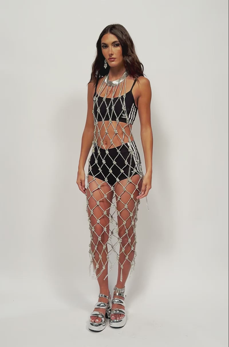 It’s giving luxury. Amp up your look with The AKIRA Label Baller Rhinestone Chain Dress. This unlined maxi dress features a knotted rhinestone rope fabrication, a metallic mock croc faux leather collar, and a backless, sleeveless design. Complete with adjustable silver metallic lobster claw closures at the back of the neck and all along the side. Style with a strapless midi dress and stiletto booties to finish off your fab look. Shown under garments not included.