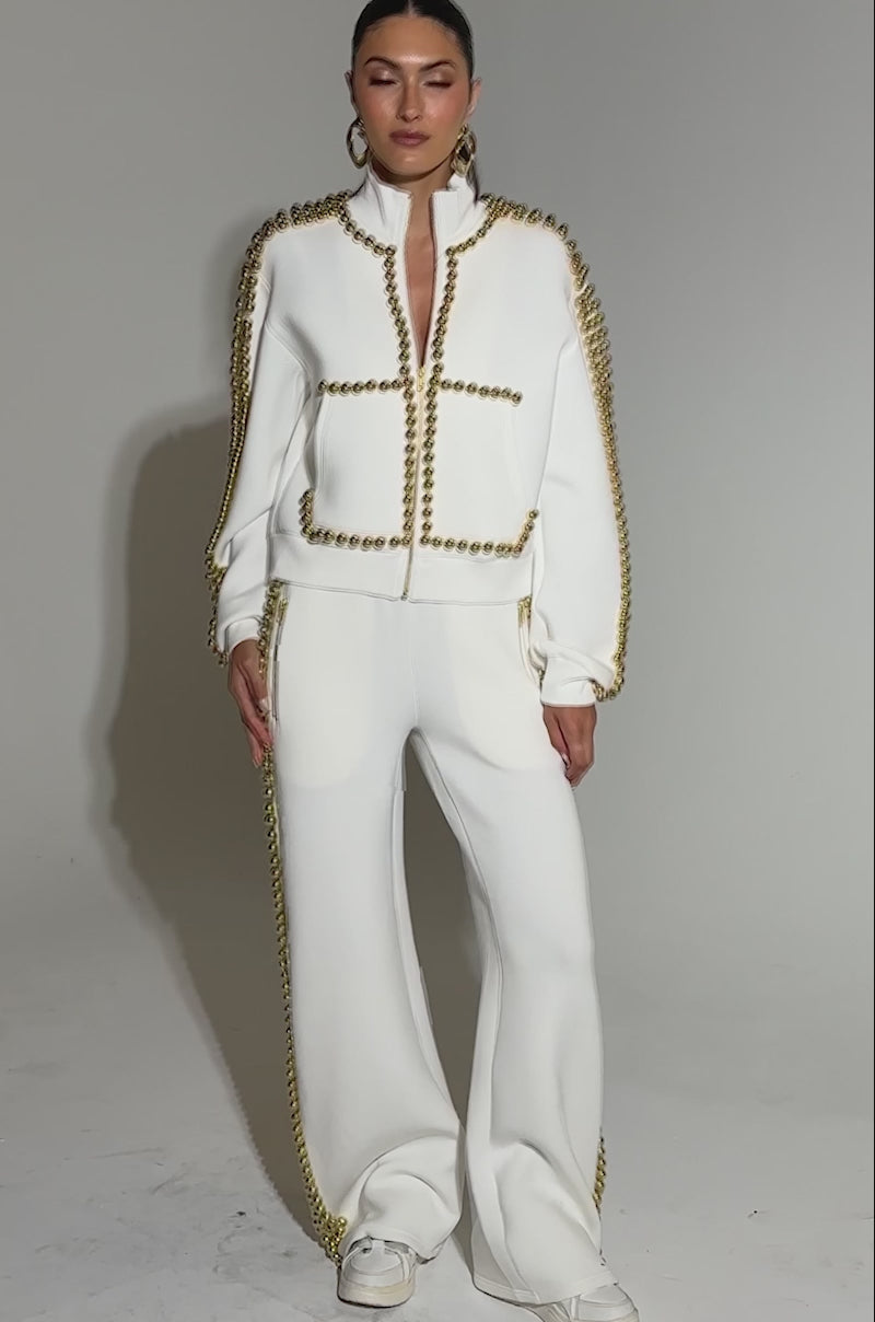 To the windooooow, to the wall! The AKIRA Label Balls To The Wall Jogger in White will have all the haters crawlin’. Crafted from a soft and stretchy, heavyweight knit blend, this statement jogger features a high-rise elastic waistband, zippered side-seam pockets, and metallic gold-tone ball embellishments that trail from hip to hem. Complete with a relaxed, wide-leg silhouette. Try pairing these with the coordinating AKIRA Label Balls To The Wall Zip Up Sweatshirt, platform sneakers, and hoop earrings for a finished look.