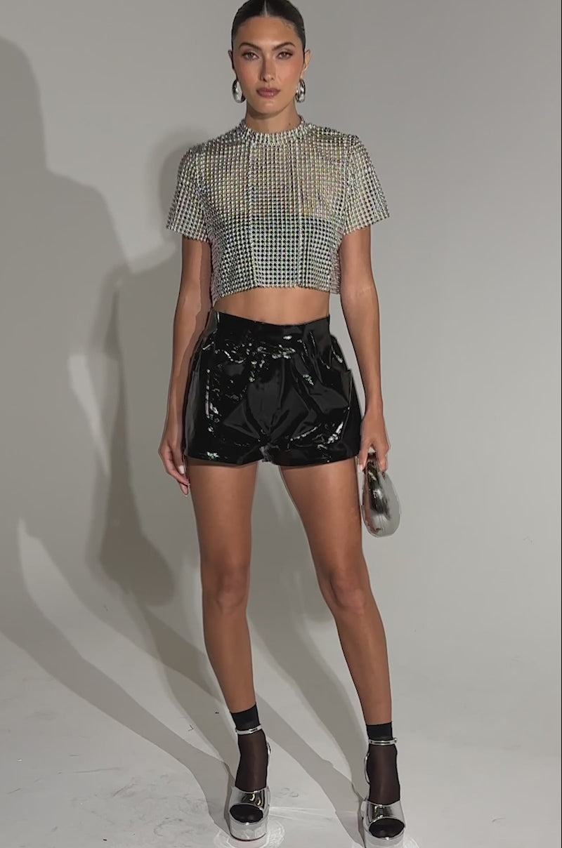 The AKIRA Label Beads For Days Tee is a total show-stopper. This fully beaded, unlined crop top features silver ball-chain embellishments woven into a grid-like pattern that drapes over the body with statement-making shimmer. Designed with a mock neck, short sleeves, and an open-back design, it’s perfect for layering over bralettes, bodysuits, or nothing at all for a daring, editorial vibe. Pair it with high-waisted trousers or a sleek mini for your next event look.