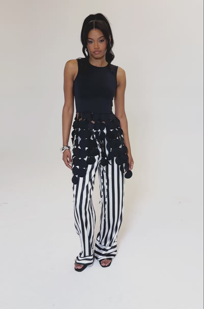 Stripes that steal scenes. The AKIRA Label Beetle Juice Vibes Satin Pants is crafted from luxurious satin and features a B&W striped pattern, a high-rise fit, functional belt loops with a faux silver metallic adjustable buckle belt, on-seam side pockets, and coordinating tassel detailing that wrap around the waist and cascade to the bottom hem. Complete with a standard front zipper closure with dual hook-and-bar fastenings, and a relaxed straight leg silhouette. Try styling with a corset and stiletto pumps for a bold finish.
