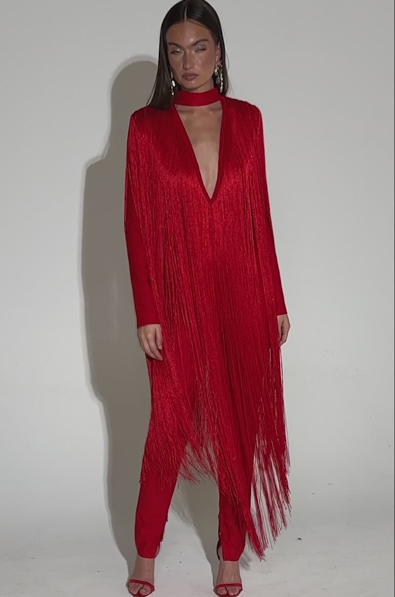 The AKIRA Label Belle Bandage Jumpsuit with Fringe delivers high drama with a sleek, stand-out silhouette and layers of cascading fringe that move with every step. Crafted from a stretchy bandage fabrication in a bold red hue, this bodyhugging baddie features a plunging neckline balanced by a choker-style collar, long sleeves, and skinny pantlegs with inner-ankle zippers. Complete with a tonal back zipper closure.