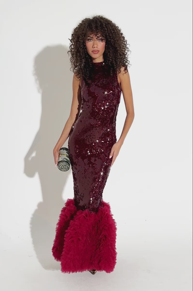 You are opulence personified in The AKIRA Label Belle Of The Ball Sequin Ruffle Maxi Dress. This gorgeous, curve-hugging gown is crafted from a smooth, semi-stretchy base fabrication in a rich wine-red shade adorned with two-way tonal sequins. It boasts a sleeveless design, a mock neckline, and a mermaid-inspired silhouette with a fabulously flamboyant, intricately layered ruffled hem made from high-quality tulle. Complete with a slick satin-lined interior and a tonal back zipper closure. Style it with burgundy heels and accessories for a marvelous monochromatic moment.