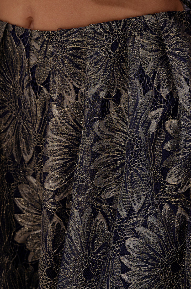 Romantic and ethereal, The AKIRA Label Best Guest Lace Palazzao Pant is crafted from sheer navy lace with a metallic floral overlay that shimmers with every movement. These botanical bottoms boast a high-rise, ultra-wide-leg silhouette, pleated detailing, a tonal side-zipper closure, and sleek built-in shorts for modest coverage. Pair them with the matching Best Guest Lace Blouse for a luxe, coordinated look.