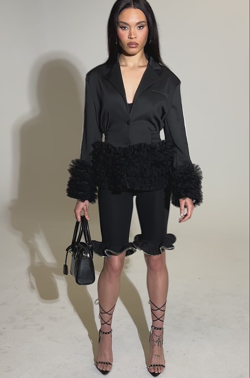 This isn't your basic blazer—it's a showstopper. The AKIRA Label Big Hit Tulle Trim Blazer is crafted from a smooth, structured stretch woven fabric and features a classic notched lapel, front button closure, padded shoulders, and elasticized waist for a tailored fit. Layered tiers of jet-black tulle wrap dramatically around the lower bodice and sleeve cuffs, adding high-volume texture. The sporty edge comes through with twin white racing stripes down each sleeve, merging streetwear grit with couture attitude.