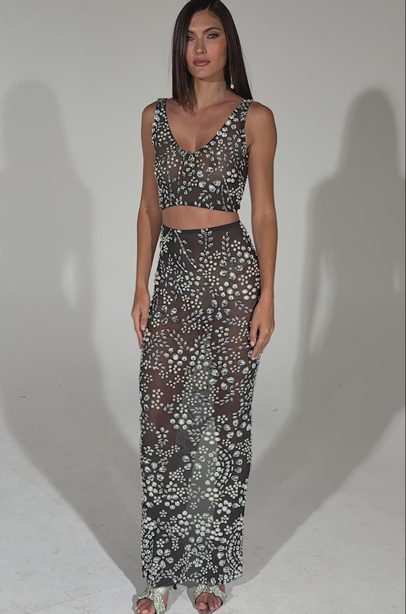 Glamour starts with The AKIRA Label Bling Bling Mesh Rhinestone Bralette. Crafted from a semi-sheer and stretchy mesh, this top features a scoop neckline, thick tank straps, and intricately covered in glittering rhinestone and pearl embellishments. Complete with a snug, cropped fit. Pair it with the matching AKIRA Label Bling Bling Mesh Rhinestone Maxi Skirt, stiletto pumps, and pearl accessories for a luxe finish.