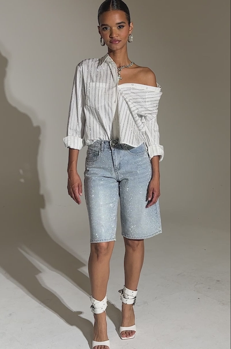 The AKIRA Label Bling Bling Rhinestone Bermuda Short was built to shine. These glitzy bottoms are crafted from non-stretch, light-wash denim and features a high-rise fit, functional belt loops, a five-pocket design, a front button-zip closure, and completely adorned in glittering rhinestone embellishments. Complete with a classic bermuda silhouette, Try styling with a relaxed blouse, frilly ankle socks, and platform loafers for an effortlessly cool ensemble.