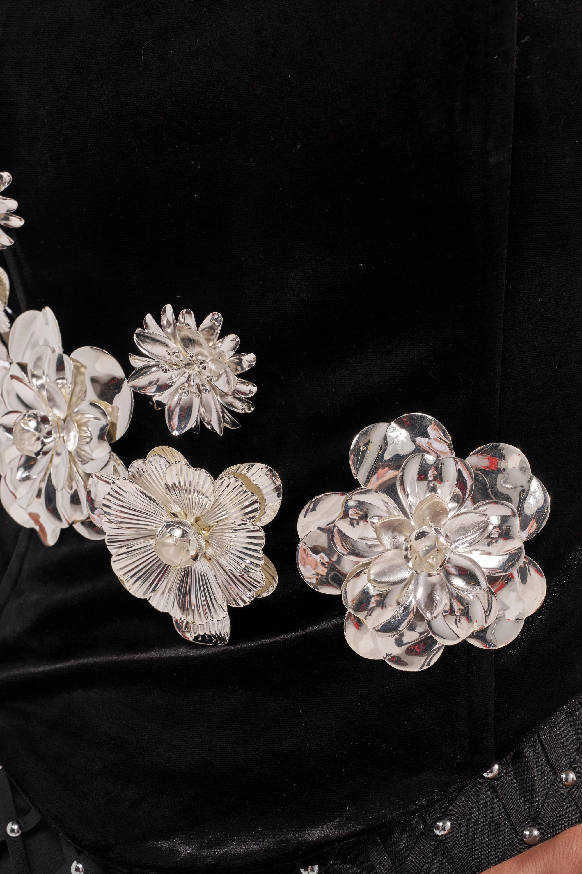 The AKIRA Label Blinging Out Corset is your after-hours power piece. Crafted from a stretch velvet base, this top features a strapless neckline with inner elastic trim, structural inner boning lining the bodice, a pointed hemline, and a full-length back zipper closure. It’s complete with silver-tone chain link detailing with 3D floral accents that wrap around the torso for an editorial look.