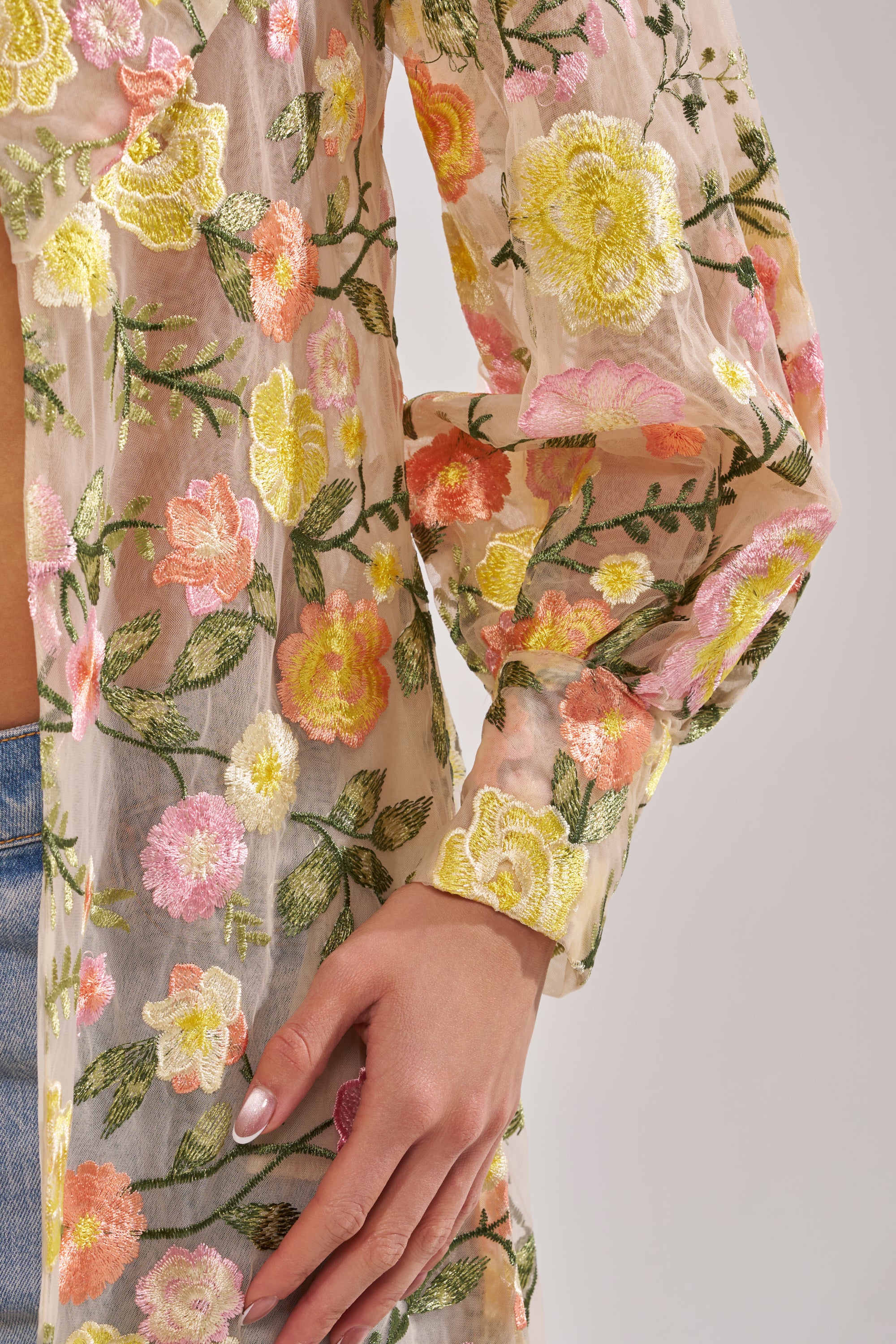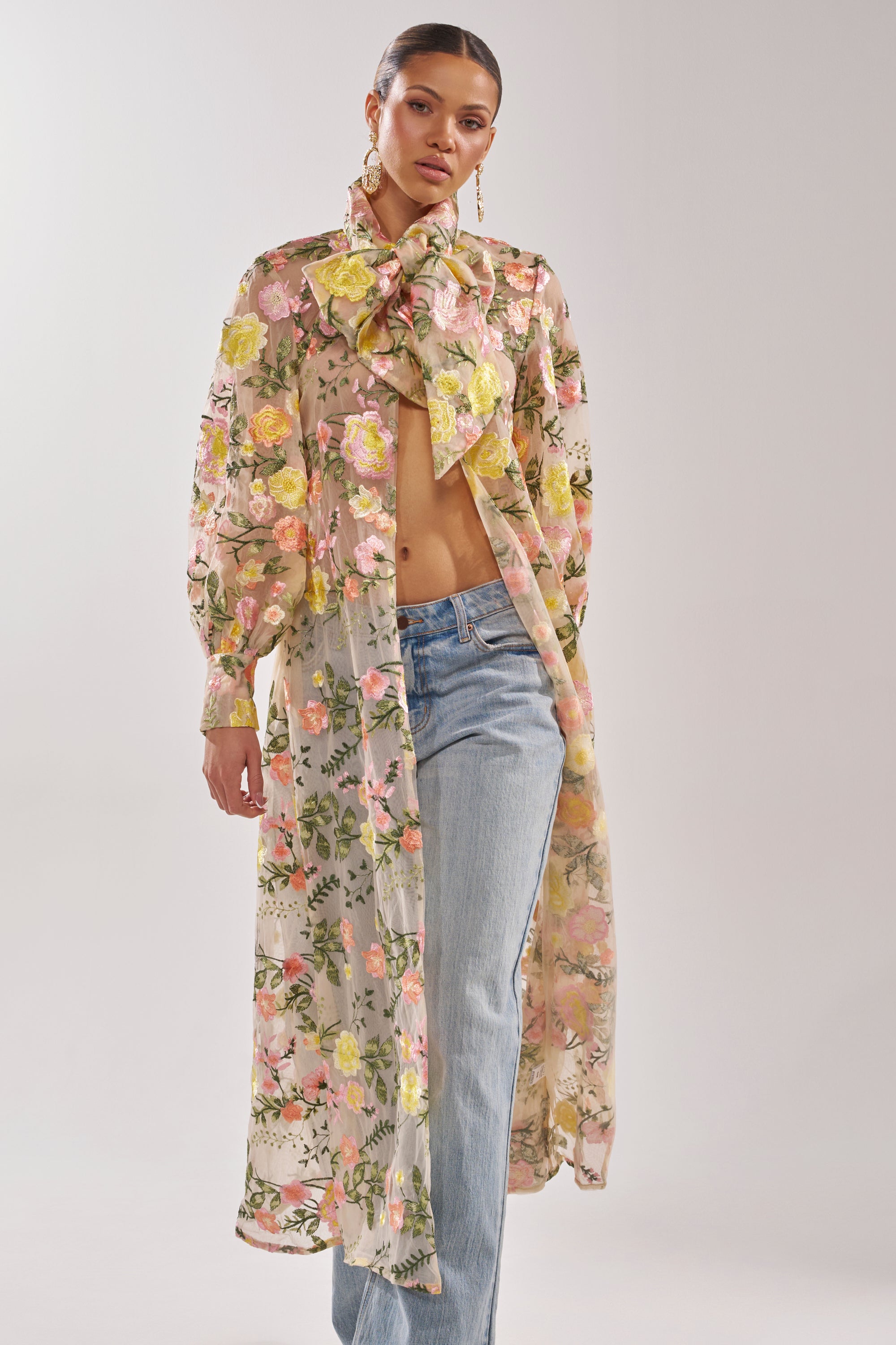 Sheer, beige floral tulle duster that adds a romantic, ethereal layer to any outfit, perfect for garden parties, bridal showers, or elegant daytime events. Designed with a lightweight, semi-transparent tulle fabric, it features an all over pastel floral embroidery, long sleeves, and a fluid maxi-length silhouette that moves beautifully with every step. The open-front design with a large tied bow allows for effortless layering over dresses, swimwear, or casual looks, making it a versatile statement piece for warm-weather styling, vacations, or special occasions.