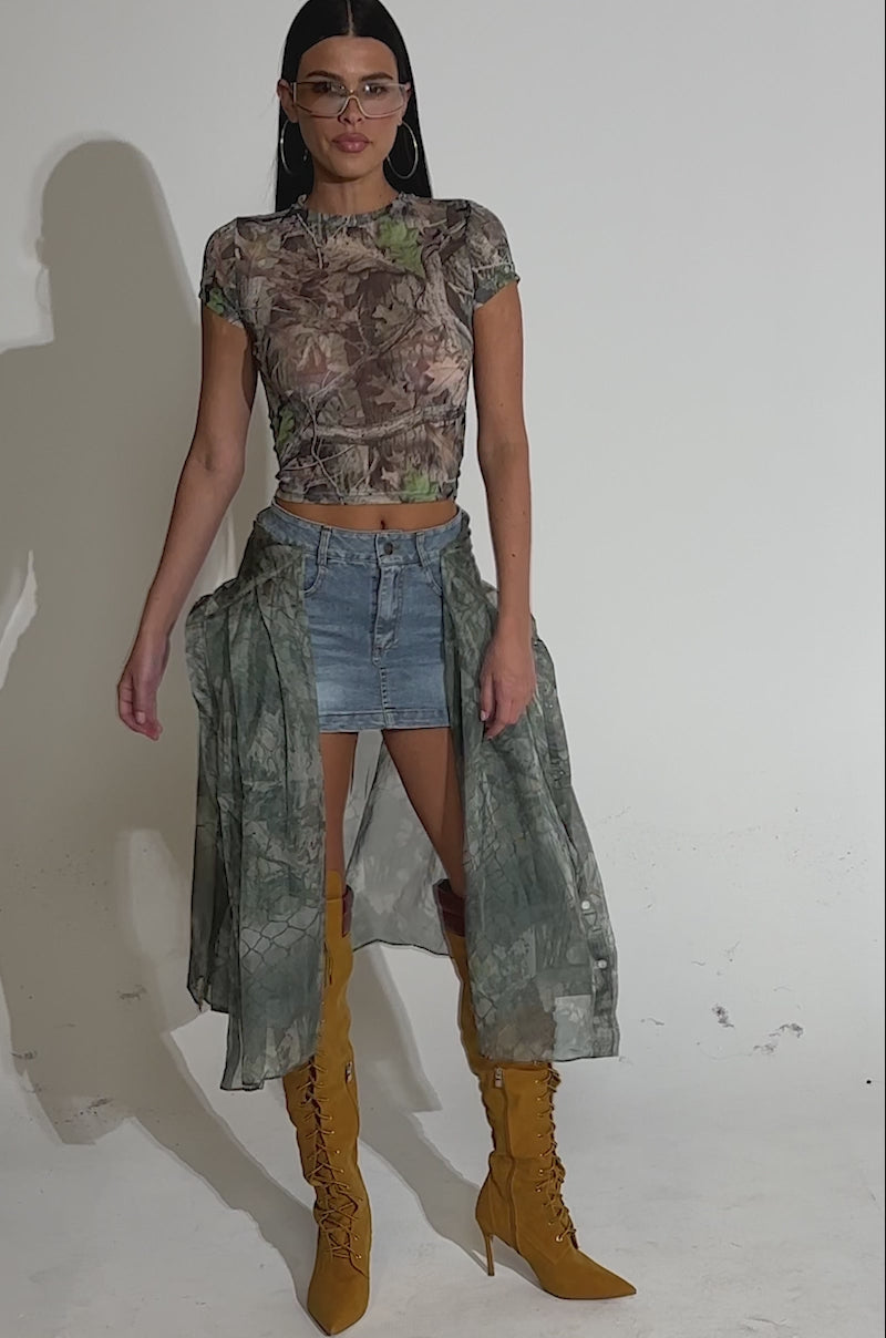 The AKIRA Label Brenda Denim Mini Skirt With Side Ties is crafted from slightly stretchy, medium-wash denim and features a high-rise fit, functional belt loops, dual waist pockets, a button-zip front closure, and flowy sheer mesh side panels with abstract patterning that wrap around to the back and cascades past the hemline. Complete with a mini-length silhouette. Style with a mesh baby tee, stiletto booties, and metallic accessories for a finished look.