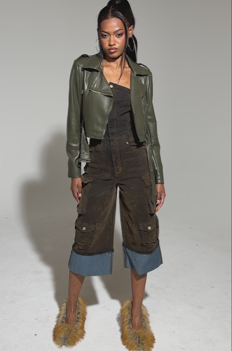 Can’t get smoother than The AKIRA Label Butter Luxe Everyday Moto. Crafted from supple faux leather, this classic moto features a wide fold over front-zip collar, decorative epaulettes on the shoulders, long sleeves with zippered cuffs, vertical zippered waist pockets, and a matching adjustable buckled belt at the hemline. Complete with a boxy, cropped silhouette. Pairs perfectly with maxi skirts or baggy cargo pants to add a little bit of edge to any outfit.