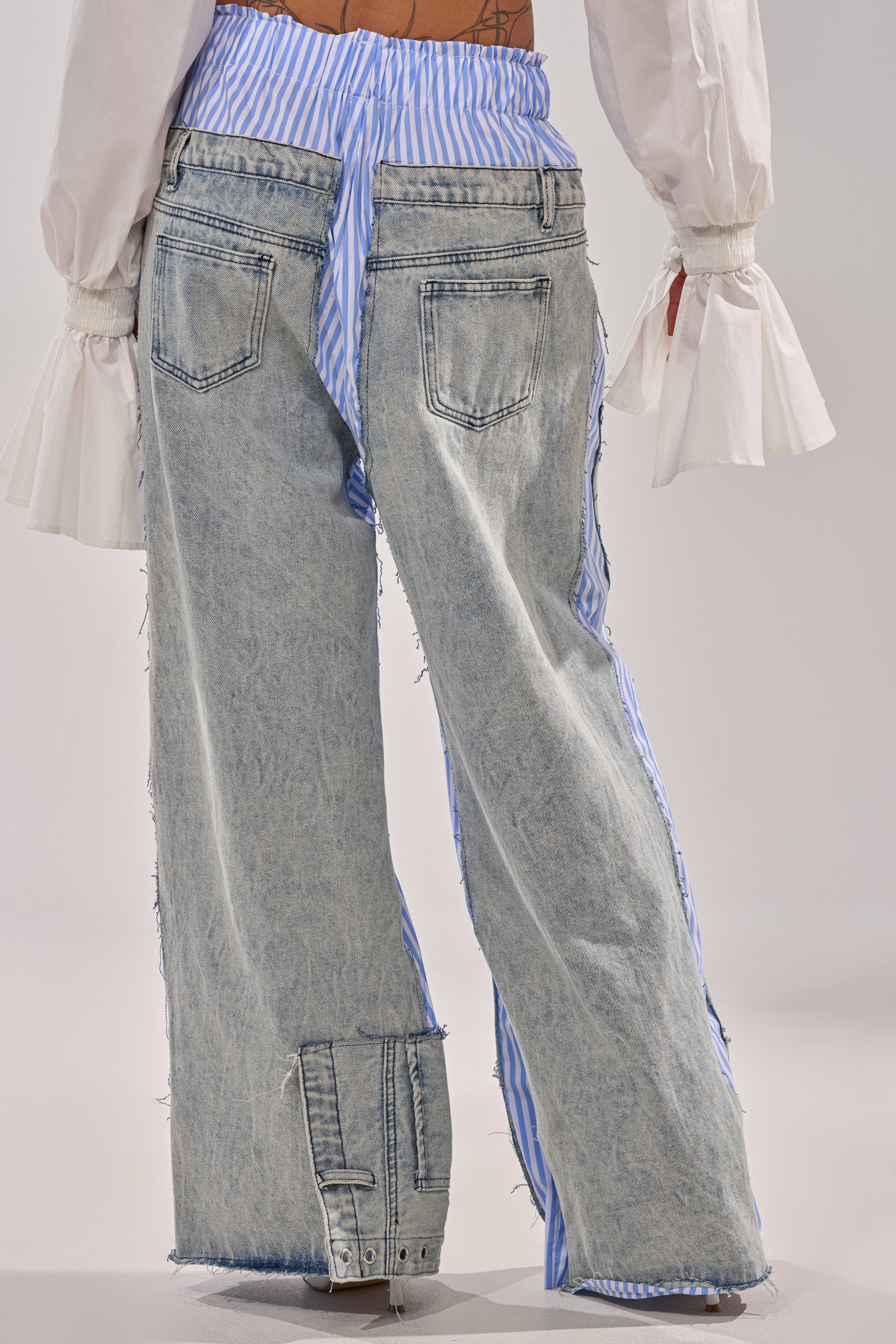 Statement hybrid denim pants with blue boxer stripe detailing that blend comfort with bold design, perfect for casual days, street-style moments, or elevated off-duty looks. Featuring an elastic waistband for an easy pull-on fit, they pair classic light-wash denim with contrast striped fabric panels for a layered, deconstructed effect. Heavy distressing throughout adds edge, while raw hems, grommets, and snap-button detailing at the cuffs bring a utilitarian finish. Designed with functional back pockets, faux front pockets, and a relaxed straight-leg silhouette, these pants style effortlessly with crop tops, bodysuits, or heels for a standout, fashion-forward outfit.