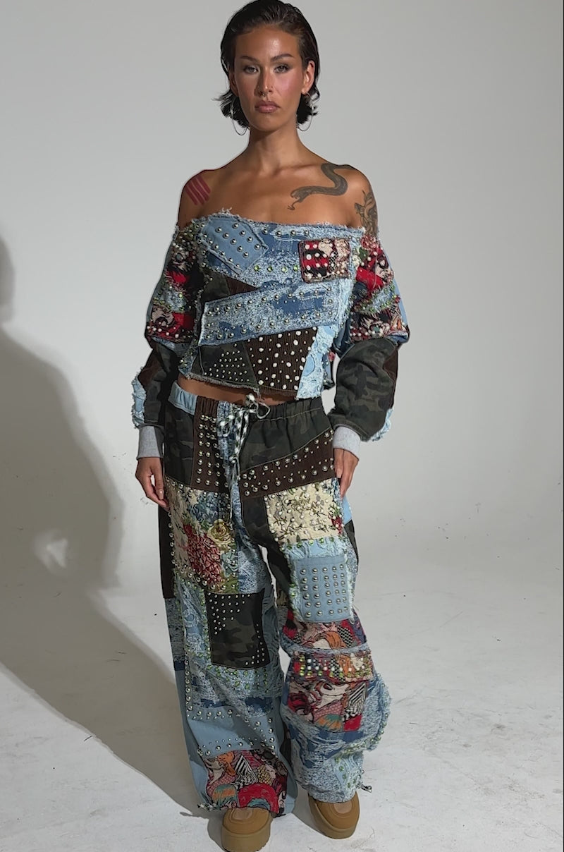 Pretty in patchwork! The AKIRA Label Call Me Crazy Patchwork Off The Shoulder Sweatshirt, a bold embodiment of eclectic streetwear. This cropped sweatshirt is made from an assortment of fabrics including distressed denim, camouflage, corduroy, and brocade panels. It’s embellished with metallic studs, rhinestones, pearl hardware, and distressed detailing. It features an off-the-shoulder neckline, long sleeves with ribbed knit cuffs, and a raw hemline. Complete with a cropped, pull-on fit. Style with the coordinating AKIRA Label Call Me Crazy Patchwork Jogger, stiletto booties, and chunky jewelry for an elevated bohemian finish.