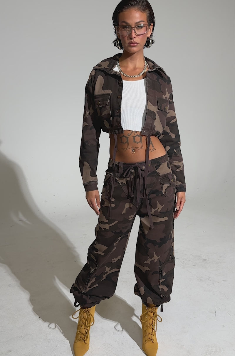 The AKIRA Label Can’t See Me Brown Camp Cargo Jogger is your go-to for rugged edge and everyday utility. Made from durable cotton with a classic brown camo print, these high-rise cargo pants feature a wide-leg silhouette in a deep brown camo print, oversized cargo-style pockets, adjustable ankle ties for an optional cinched look, and a self-tie closure at the waist. Complete with a front button-zip fly. Pair with the coordinating AKIRA Label Can't See Me Brown Camo Cropped Button Down, platform boots, and chunky silver jewelry for a utilitarian-chic finish.