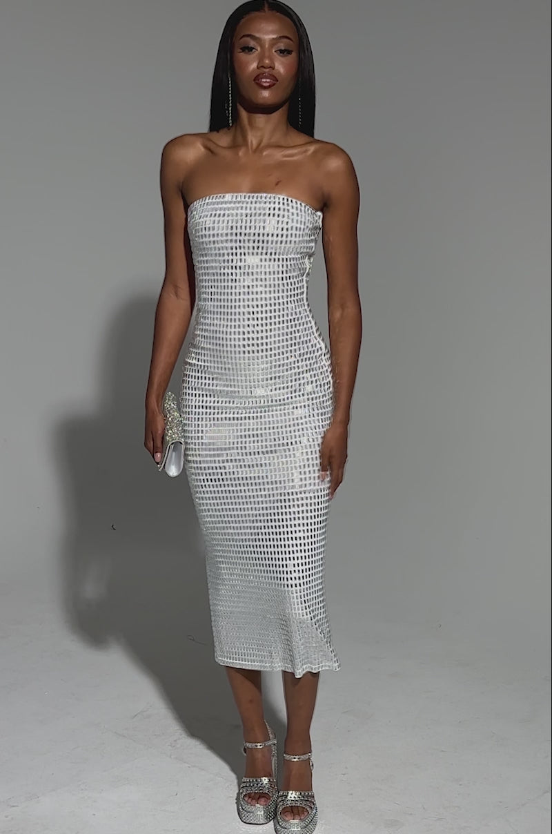 The glow is non-negotiable in The AKIRA Label Can’t Shine Brighter Than Me Rhinestone Midi Dress In White. Crafted from a double-lined mesh, this stunner features a strapless neckline with inner elastic trim, a concealed side zipper closure, a stretchy inner slip, and adorned in shimmering rectangular rhinestone embellishments throughout. Complete with a slinky, midi length. Style with kitten heels and metallic accessories to turn heads wherever you go.