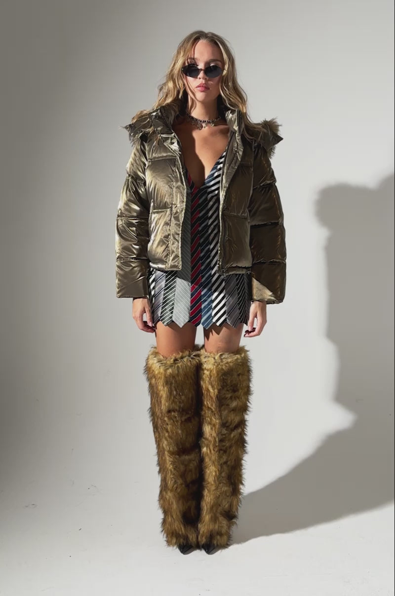 Stay cozy nā stylish in The AKIRA Label Capri Fur Trim Puffer. This chic outerwear is crafted from an ultra-warm metallic polyester base and features a paneled construction, a standing collar, an attached oversized hood with plush fur trim, long sleeves with elastic inner cuffs, side slant front pockets, a faux hematite front zipper with snap button closures. Complete with a sleek inner lining, and a cropped, puffer silhouette. Style with cargo pants, cargo boots, and a knit scarf to keep the cold at bay.Ā