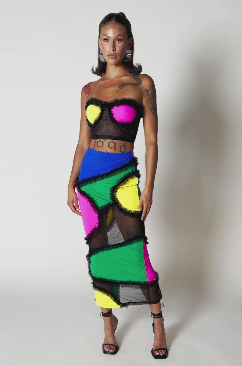 Cheers! Life is one big party in The AKIRA Label Carnivale Tulle Detail Tube Bra. This festive top is crafted from a stretchy, mesh base fabrication and features a strapless, bustier-inspired silhouette with neon dual-tone, padded bust cups framed by ruffled tulle. It’s complete with a tonal back zipper closure. Style it with the coordinating Carnivale Tulle Detail Midi Skirt and platform sandals and raise your glass!