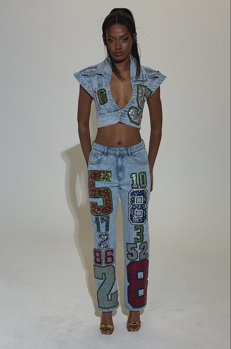 Play it bold in The AKIRA Label Champion Graphic Denim Blouse, a sleeveless denim top that blends varsity spirit with street-style edge. This standout piece features a light-wash, structured denim base with a pointed collar, a flared construction at the shoulders, and adorned with oversized sequin number appliqués across the chest and shoulders. Designed to be worn open or buttoned-up, it brings vintage athletic vibes into the now with modern flair and sparkle. Complete with a cropped silhouette. Style with the coordinating AKIRA Label Champion Graphic Denim Pant, platform sneakers, and chunky jewelry for a finished look.