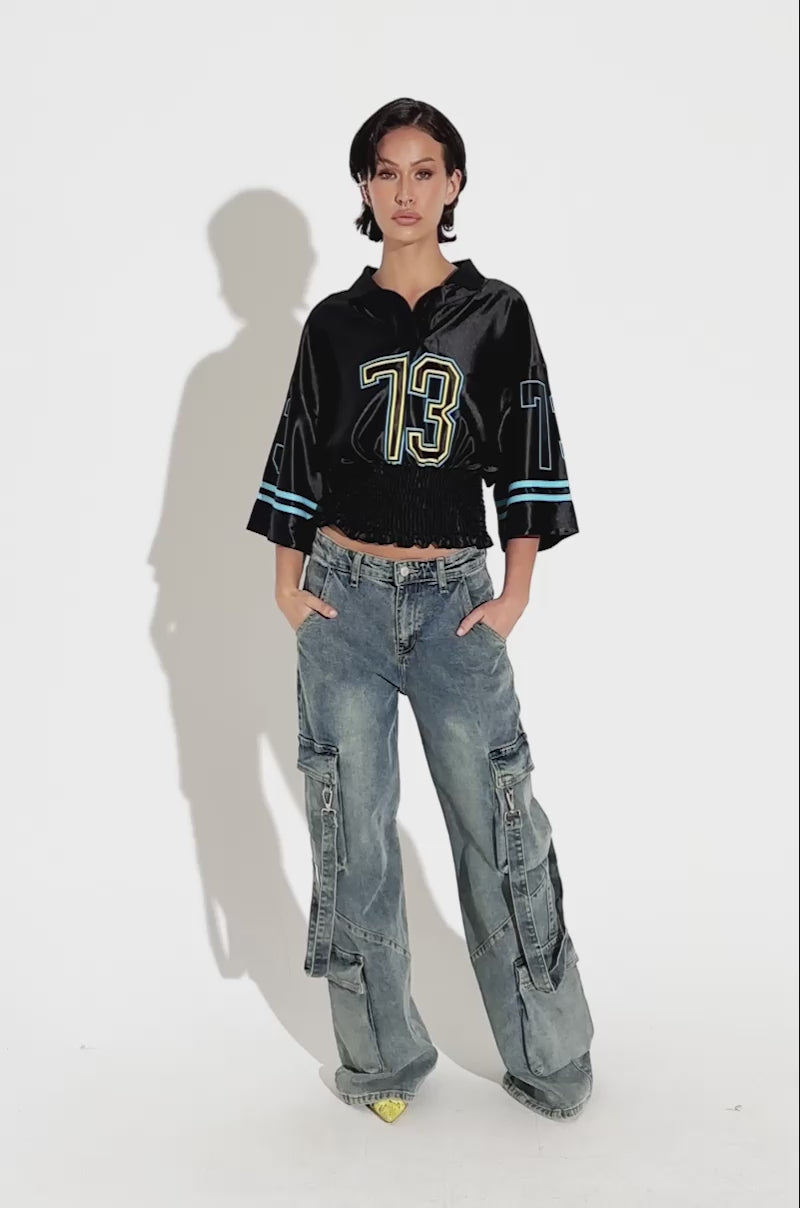 Don’t fumble your game day ‘fit! The AKIRA Label Championship Scrunch Jersey is crafted from a silky jersey fabrication and features a V-neckline and fold-over collar, short sleeves with varsity-inspired stripes and a screenprinted “73” graphic, a smocked, stretchy waist and ruffled hemline, and a dual-tone “73” graphic printed on the chest.