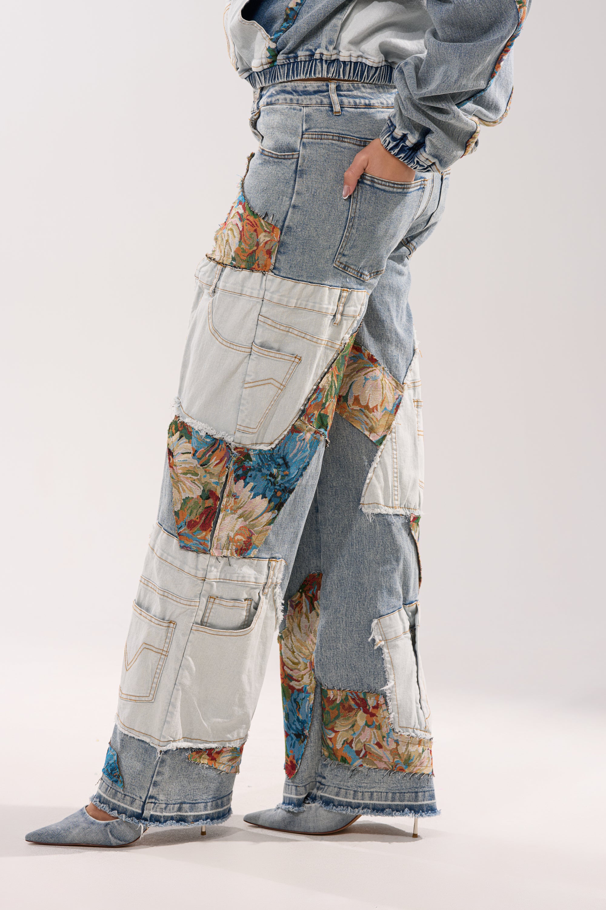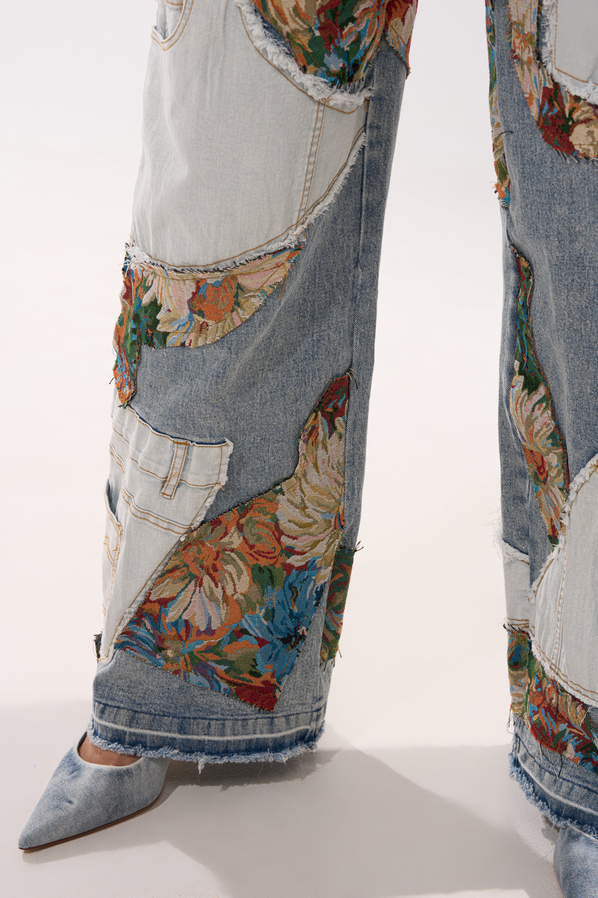 These funky patchwork wide-leg jeans are crafted from a mixed-wash denim with textured tapestry panels for a bold, one-of-a-kind look. They feature a high-rise waist, functional belt loops, a classic five-pocket design, a button-and-zip fly closure, dramatic colorblocked patchwork throughout, raw frayed edges, and an effortless wide-leg silhouette. Style them with the coordinating AKIRA Label Change It Up Denim Sweatshirt and stiletto booties for a vintage vibe.