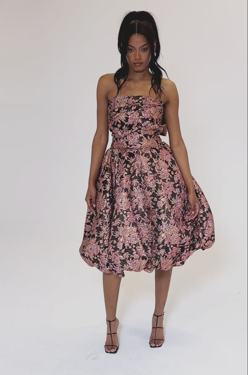 Show off your glamor in The AKIRA Label Charlotte Brocade Midi Dress. This stunner is crafted from double-lined mesh with a shimmering metallic brocade print throughout, a strapless neckline with inner elastic trim, a flattering ruched bodice, a self-tie strap with a lower-back cut out, a bubble bottom hem with inner tulle for structure, a metallic back zipper closure, and a sleek inner lining. Complete with a midi length silhouette. Style with stiletto pumps, metallic accessories, and a bold lip for a finished look.