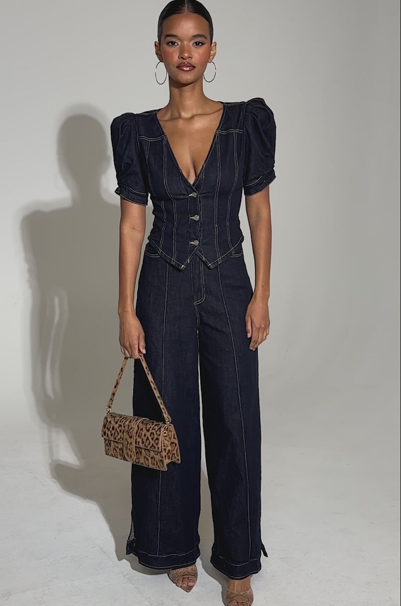 Serve it-girl energy in The AKIRA Label Chic AF Denim Jumpsuit. This structured, wide-leg jumpsuit features a dark indigo wash, short, ruched puff sleeves, and a deep V-neckline. The tailored bodice includes a notched waistline, princess seams, and a pointed, vest-like hem with button-down closures. The back has a fitted belt detail with D-ring hardware and rear pockets. Finished with a zippered front fly and contrast topstitching throughout.