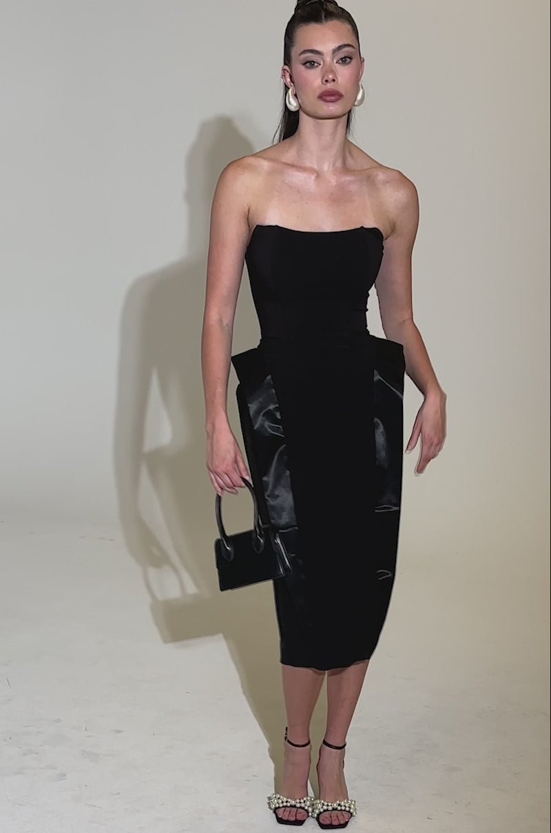 The AKIRA Label Chic And Sophisticated Structured Midi Dress is the ultimate power piece for modern elegance. This sleek, strapless black midi dress is crafted from smooth, slightly-stretchy fabric and features a tailored silhouette, a sculpted bodice with inner boning, and bold, structured hip accents in tonal satin that create a striking hourglass shape. Complete with a metallic back zipper closure and a curve-hugging fit. Style with stiletto pumps, a red lip, and a shimmery clutch for an effortlessly tasteful finish.