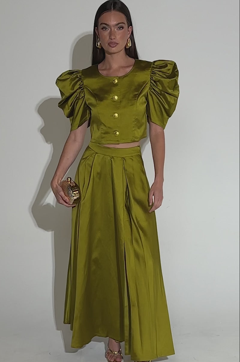 The AKIRA Label Chic Lady Button Down Blouse is crafted from a sleek, cotton-blend fabric and features a rounded neckline, structured short puff sleeves, contour seaming on the bodice, and ornate gold-tone button front closures. Complete with a fitted, cropped silhouette. Style it with the matching AKIRA Label Chic Lady Maxi Skirt, strappy stilettos, and pearl accessories for an effortlessly classy, refined ensemble.