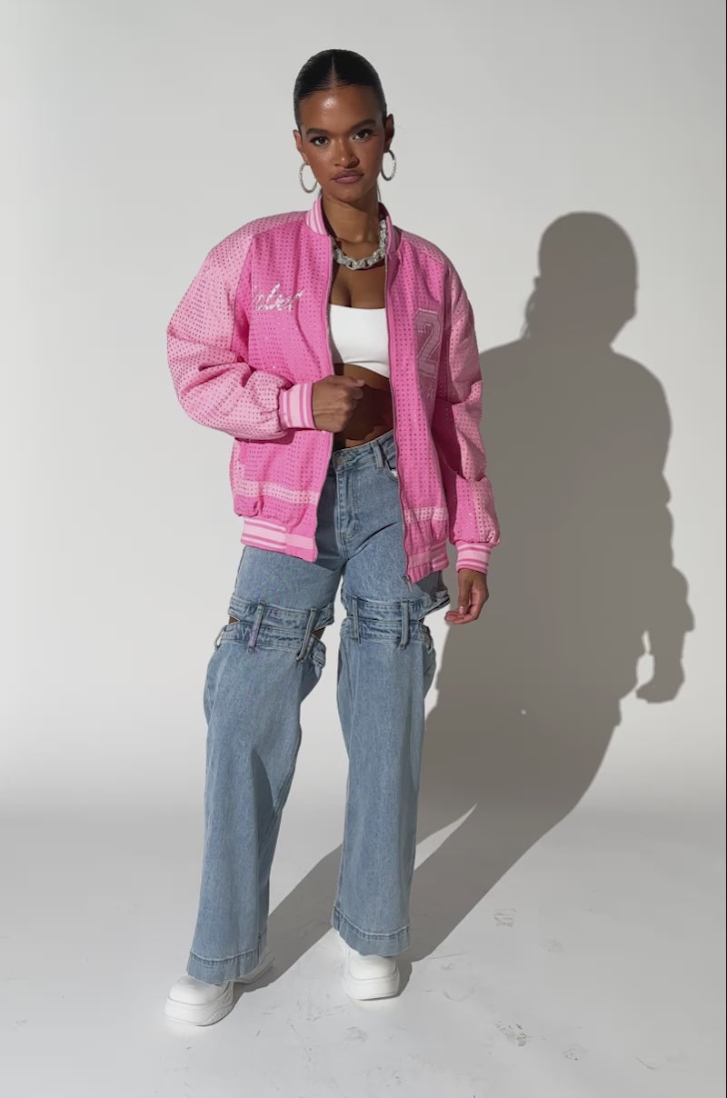 Bright lights, big city, Chicago nights. Rep your fave city in The AKIRA Label Chicago Made Embroidered Bomber. This sweet outerwear features a classic canvas fabrication, a two-tone colorway, striped ribbed knit hems throughout, a standing collar, long sleeves with cinched cuffs, dual side slant front pockets, and a quilted satin inner lining. Complete with sporty embroidered detailing on the front and back including block lettering “Reckless Chicago Made Me” on the back, glittering AB tonal rhinestone embellishments, a faux silver metallic front zipper closure, and an oversized silhouette. Style with a pleated skirt and knee-high boots to strut Mag Mile in style.