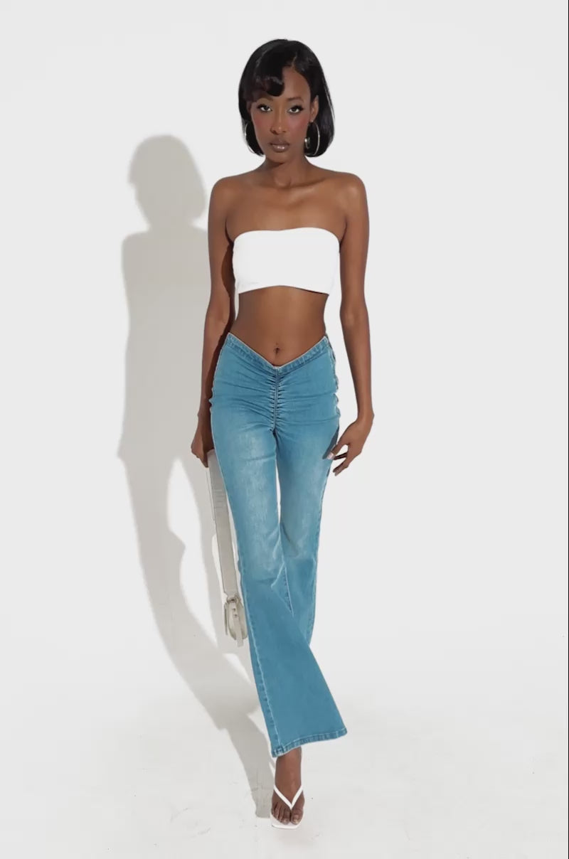 Catch stares when you wear The AKIRA Label Cinched Up Denim Pants In Medium Wash. These sultry jeans are crafted from a semi-stretchy, medium wash cotton denim base and feature a high rise, V-waist design, flattering ruched detailing on the front crotch and rear, contrast stitching, and a metallic side zipper closure. Complete with a flare leg silhouette. Style with a corset and platform pumps for a finished look.