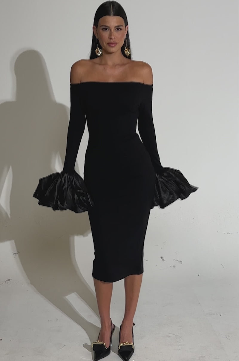The AKIRA Label Class With A Little Bit Of Sass Midi Dress is a timeless silhouette with a dramatic twist. Crafted from a sleek and stretchy fabric, this elegant midi hugs the body in all the right places. It features an off-the-shoulder neckline with inner elastic trim, long sleeves with voluminous, tonal satin ruffle cuffs, a back vent slit, and a concealed back zipper closure. Perfect for cocktail events, evening soirées, or upscale dinners.