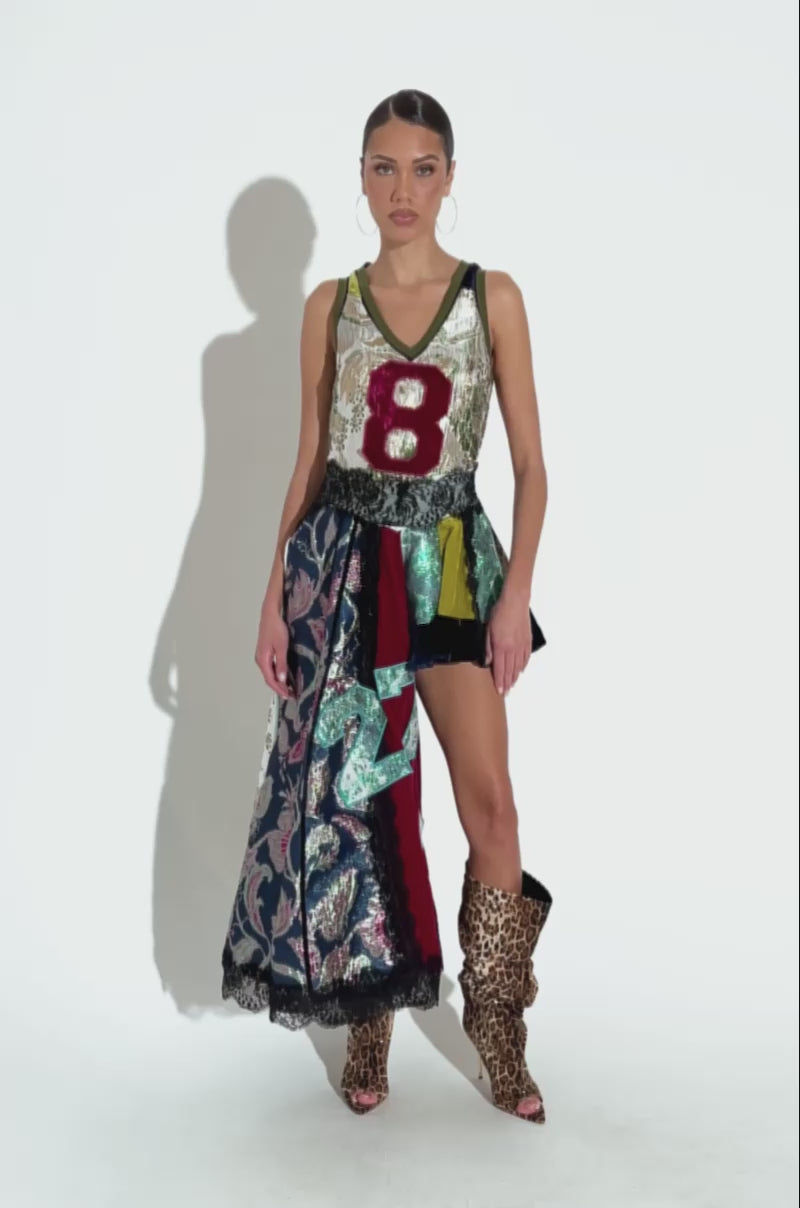 Power-clashing is in this season! The AKIRA Label Cleat Chaser Layered Jersey High-Low Dress in Brocade is a maximalist number crafted from an assortment of colorful, non-stretch brocade and velvet fabrications. It boasts an asymmetrical mini/maxi silhouette, a sleeveless design, a ribbed V-neckline, a slick built-in slip, and a tonal side-zipper closure. In addition to the various colors and patterns throughout, it features a lace-trimmed waist and hem and a prominently embroidered, crushed velvet #8 jersey number on the bodice.