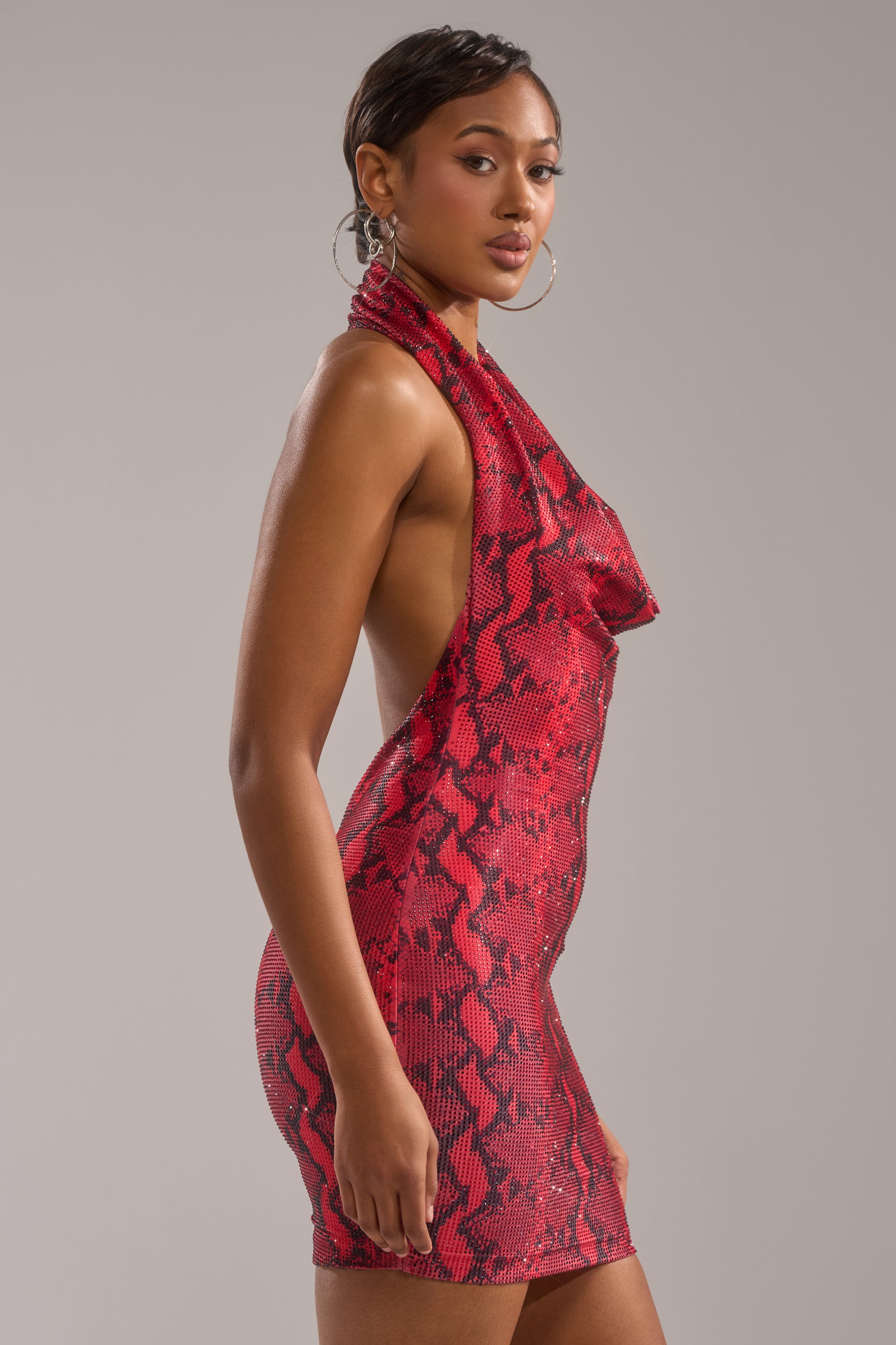 The AKIRA Label Cocky AF Rhinestone Snake Mini Dress is crafted from a sleek-stretch fabric with a classic snake print and covered in all-over, glittering rhinestone embellishments. This red-hot mini features a halter-style design with a draped cowl neckline, a low-cut back, and a slinky, curve-hugging fit. Style with strappy stilettos and a vampy lip to paint the town red.