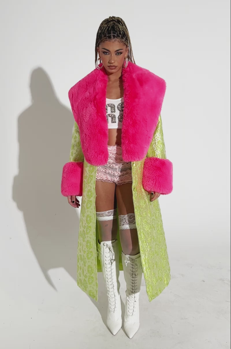 Polly Pocket, but make her life-sized. The AKIRA Label Color Me Pretty Brocade Trench is the coat of your dress-up dreams! Crafted from a subtly shimmery, non-stretch brocade fabrication, this playful maxi-length coat features a neon pink, extra-wide, detachable faux fur collar, long sleeves with coordinating faux fur cuffs, spacious side seam pockets, a button front closure, and smooth, silky interior lining. Style it with Y2K-inspired accessories for a perfectly doll-like look.