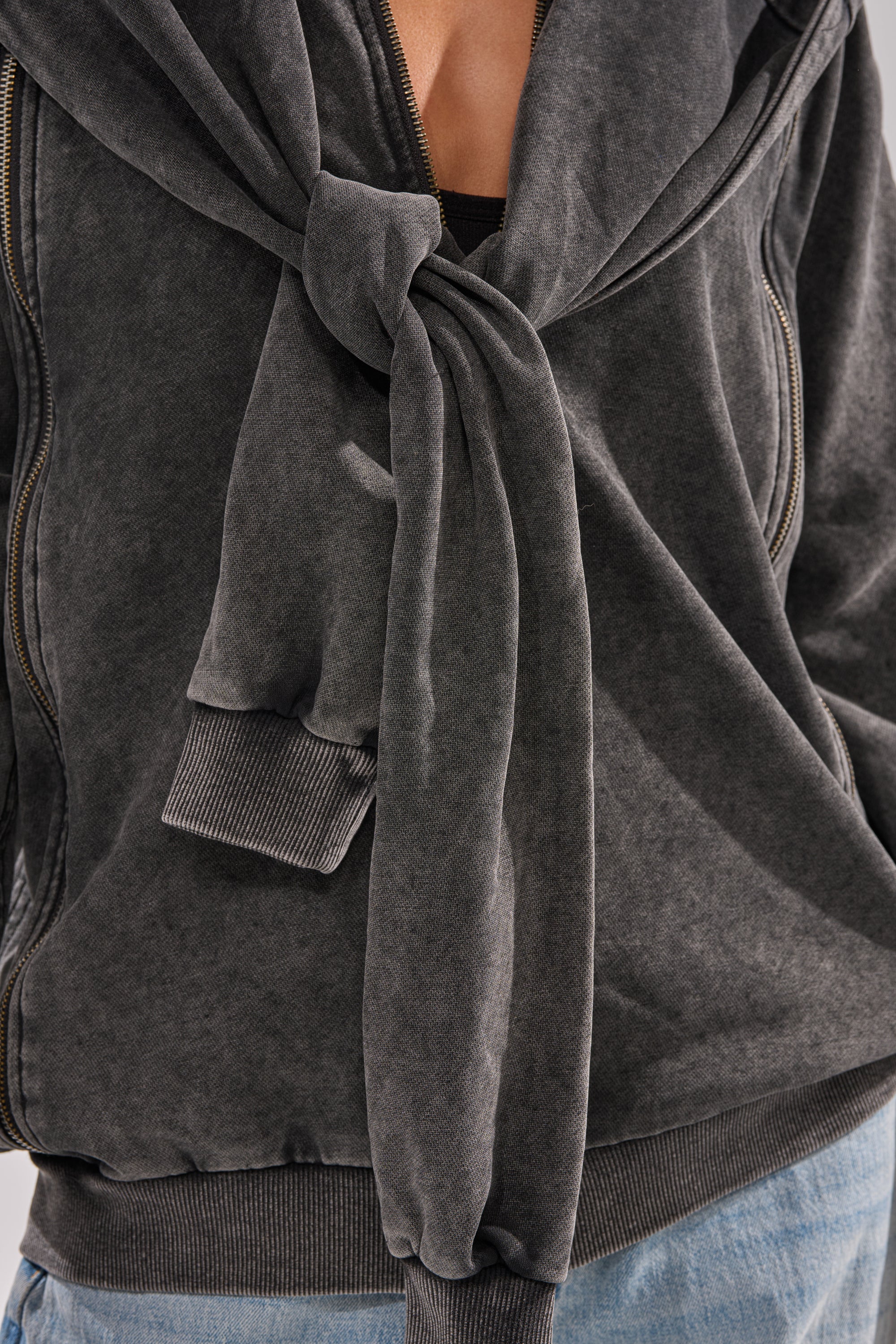 Your aura is off the charts in The AKIRA Label Cool Gal Tie Sweatshirt. Crafted from a soft, cotton knit fabric in a washed charcoal colorway, this elevated sweatshirt boasts an attached hood, long sleeves with functional zipper detailing running the full length, a front zipper closure, and an integrated tie-front panel, mimicking the look of a sweatshirt casually draped over the shoulders. Perfect for errand days, airport outfits, or elevated loungewear styling.