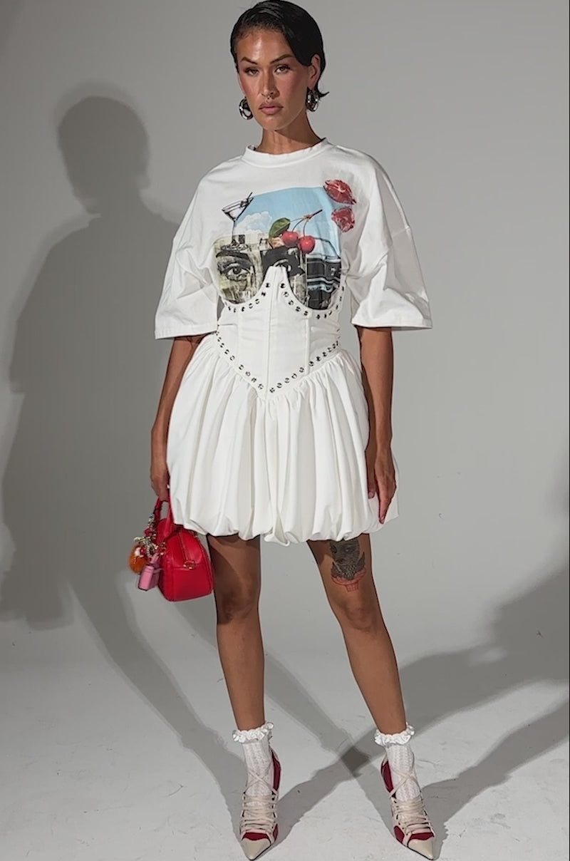 CTRL+ ALT + SLAY. The AKIRA Label Cool Girl Loading Mini Dress features an oversized graphic tee fused with a structured corset-style bodice with inner boning and lined with silver grommet detailing that cinches the waist and flares into a voluminous, flouncy bubble hem skirt. The tee boasts a classic ribbed knit crew neckline, short sleeves, and showcases a bold collage print of surreal eyes, cherries, lipstick marks, and vintage elements. Complete with a metallic back zipper closure, and a mini-length silhouette.
