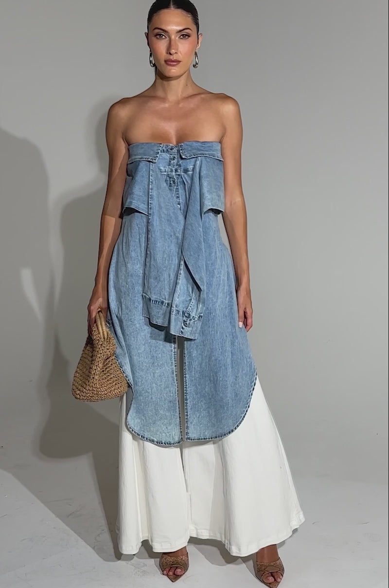 The AKIRA Label Crazy For You Denim Blouse is constructed from lightweight, medium-blue denim with a stonewashed finish. Designed as an off-the-shoulder silhouette, this blouse mimics a deconstructed button-up shirt with a front button placket, collared neckline, and decorative long sleeve details that drape from the bust. Complete with an asymmetrical high-low hemline with pointed side panels.