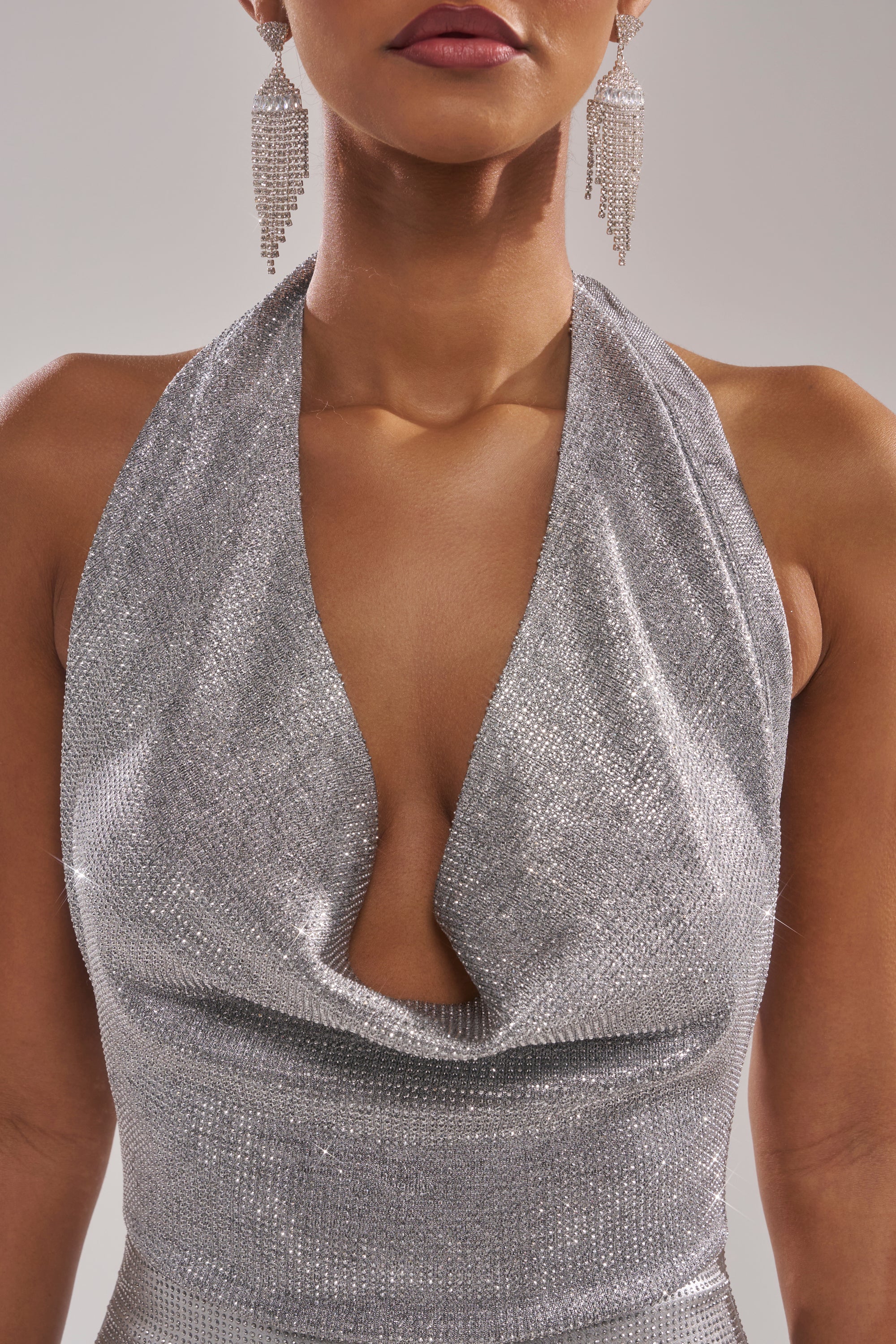 The AKIRA Label Dance The Night Away Rhinestone Jumpsuit was made to out-glow the disco ball. This glitzy one-piece is crafted from a sleek, woven knit metallic fabric interwoven with rhinestone embellishments throughout. It features self-tie halter straps, a plunging cowl neckline, a low-cut back, a concealed back zipper closure, and a skinny-leg silhouette. Complete with a curve-hugging, sculpted fit. Pair with platform pumps, a red lip, and an oversized fur coat for a jaw-dropping finish.