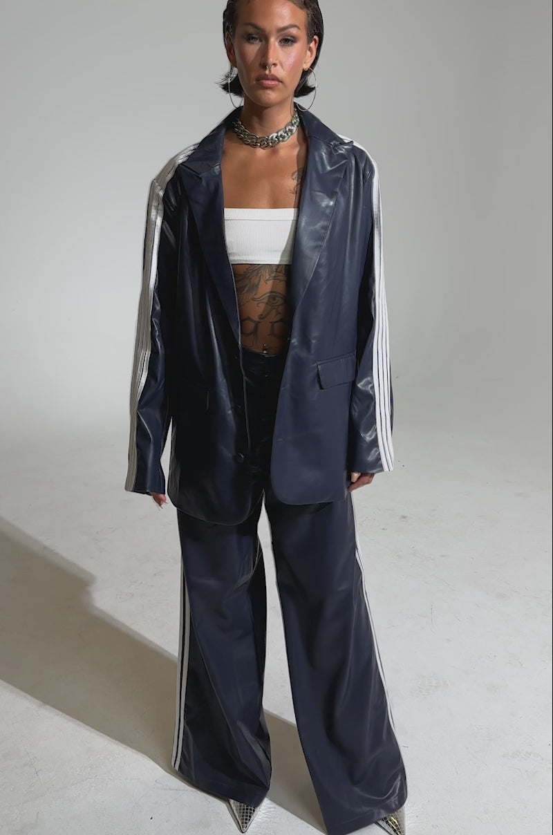 Suited up and sporty. The AKIRA Label Daytime Lovin’ Trouser in Navy is crafted from supple, subtly pebbled faux leather and features a high-rise, wide-leg silhouette, pleated thigh detailing, spacious side-slant pockets, and athletic accent stripes that run from waist to hem. Complete with soft inner lining and a zippered hook-and-bar front closure, these pants pair perfectly with the coordinating Daytime Lovin’ Blazer.