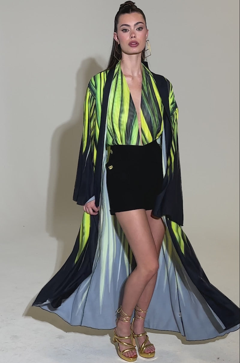 Go green with The AKIRA Label Deep In The Woods Duster. Crafted from a lightweight, silky satin fabrication, this eye-catching piece features an oversized, maxi-length silhouette, a robe-like, open-front design, long bell sleeves, and a bold, abstract graphic print in lush shades of green throughout. Wear it with the coordinating Deep In The Woods Bodysuit for a fresh ‘fit.